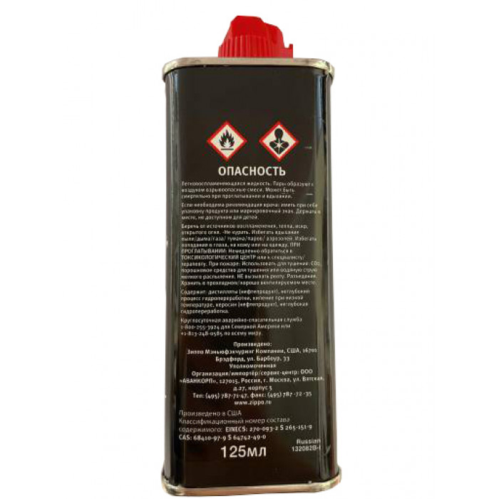 Первоклассное оригинальное топливо Zippo для эффективного функционирования ветроустойчивых зажигалок и грелок для рук Zippo. Поставляется в индивидуальной металлической канистре объёмом 125 мл.