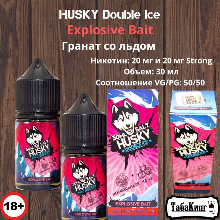 Жидкость для заправки электронных сигарет HUSKY Double Ice Salt Explosive Bait со вкусом Гранат со льдом. Содержит солевой никотин. Поставляется во флаконе с удобной крышкой.